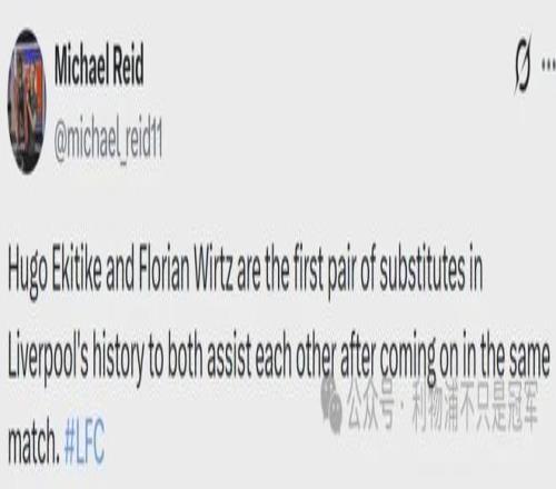 维尔茨和埃基蒂克也成为利物浦队史第一对替补出场后互送助攻的球员,这两人之间逐渐擦出火花,对于利物浦在进攻上更有创造力、破密集防守至关重要,本场他俩在替补出场后互送助攻是除了赢球之外最大的欣慰。