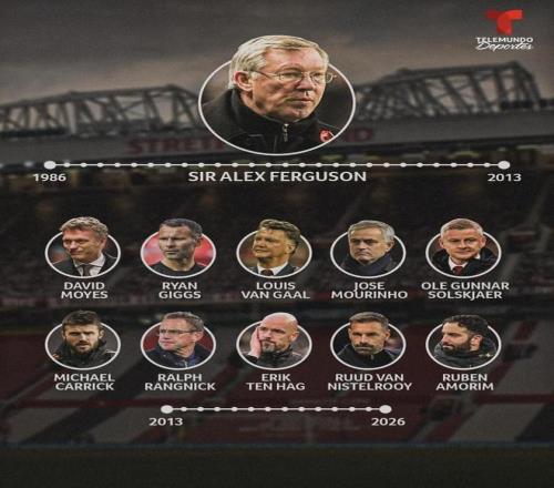 最近Telemundo Deportes做了一张图,把弗格森从1986年带到2013年的那条时间线,和2013年之后曼联“不断换帅”的现实摆在一起。2013年到2026年,主帅(含临时)一共换了10位:有人只带了3场、4场就走,也有人扛了两三年但最后还是下课;奖杯这边,能算得上“拿得出手”的,主要集中在莫耶斯那座社区盾、范加尔的足总杯、穆里尼奥的三冠、滕哈赫的两座杯赛冠军上。只看成绩和荣誉,弗格森之后到底谁才是最成功的那一个?(数据截至2026年1月)